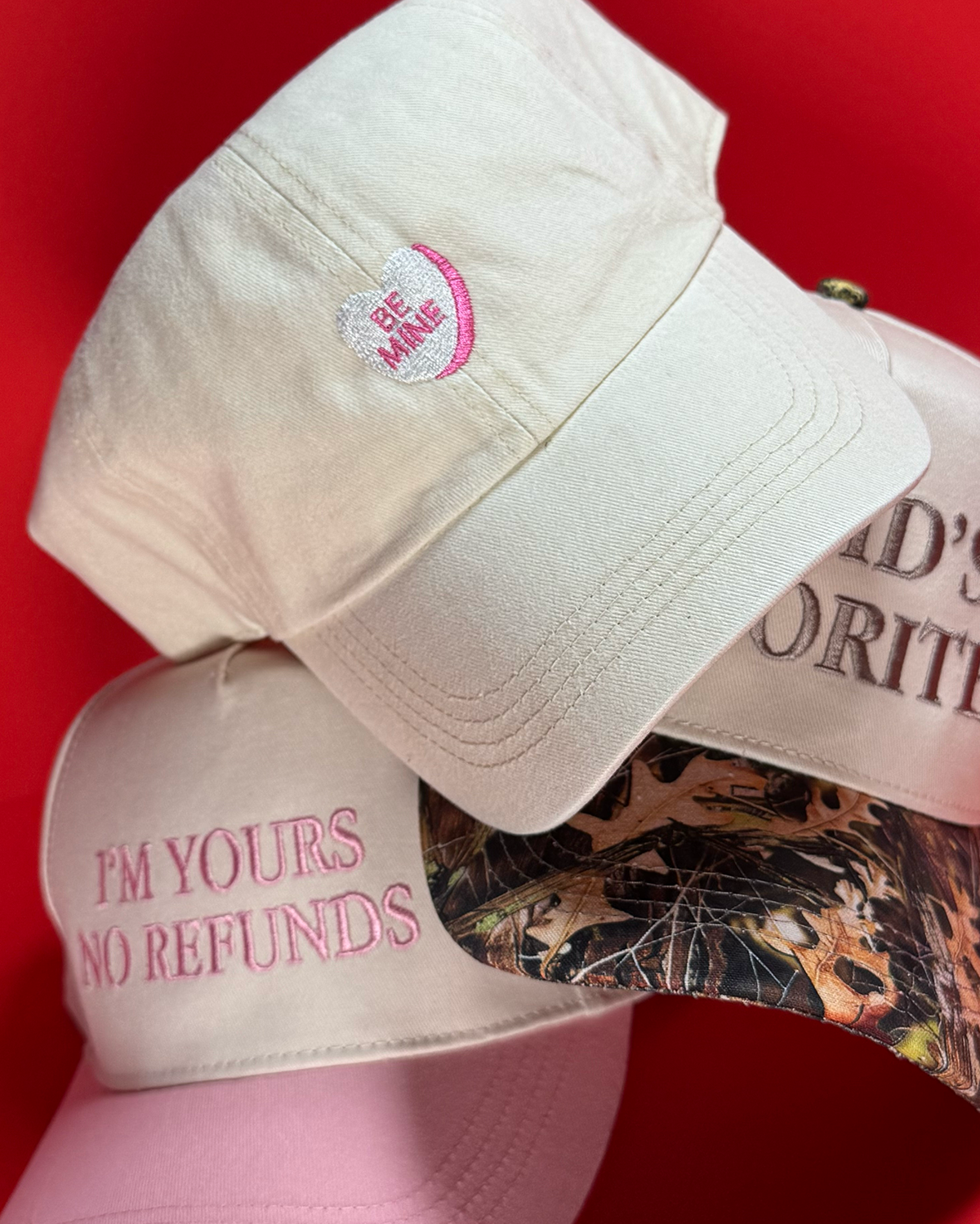 Declare yourself Cupid’s favorite with this playful beige and camo baseball cap. Featuring “Cupid’s Favorite” embroidered in soft taupe lettering and a camo-patterned visor, it’s the perfect mix of romance and rugged style. The cap also features the Bugzie & Bubby Peace Love sign embroidered for an extra touch of personality. Whether you’re heading out for a casual date or a day in nature, this cap has you covered in comfort and charm.